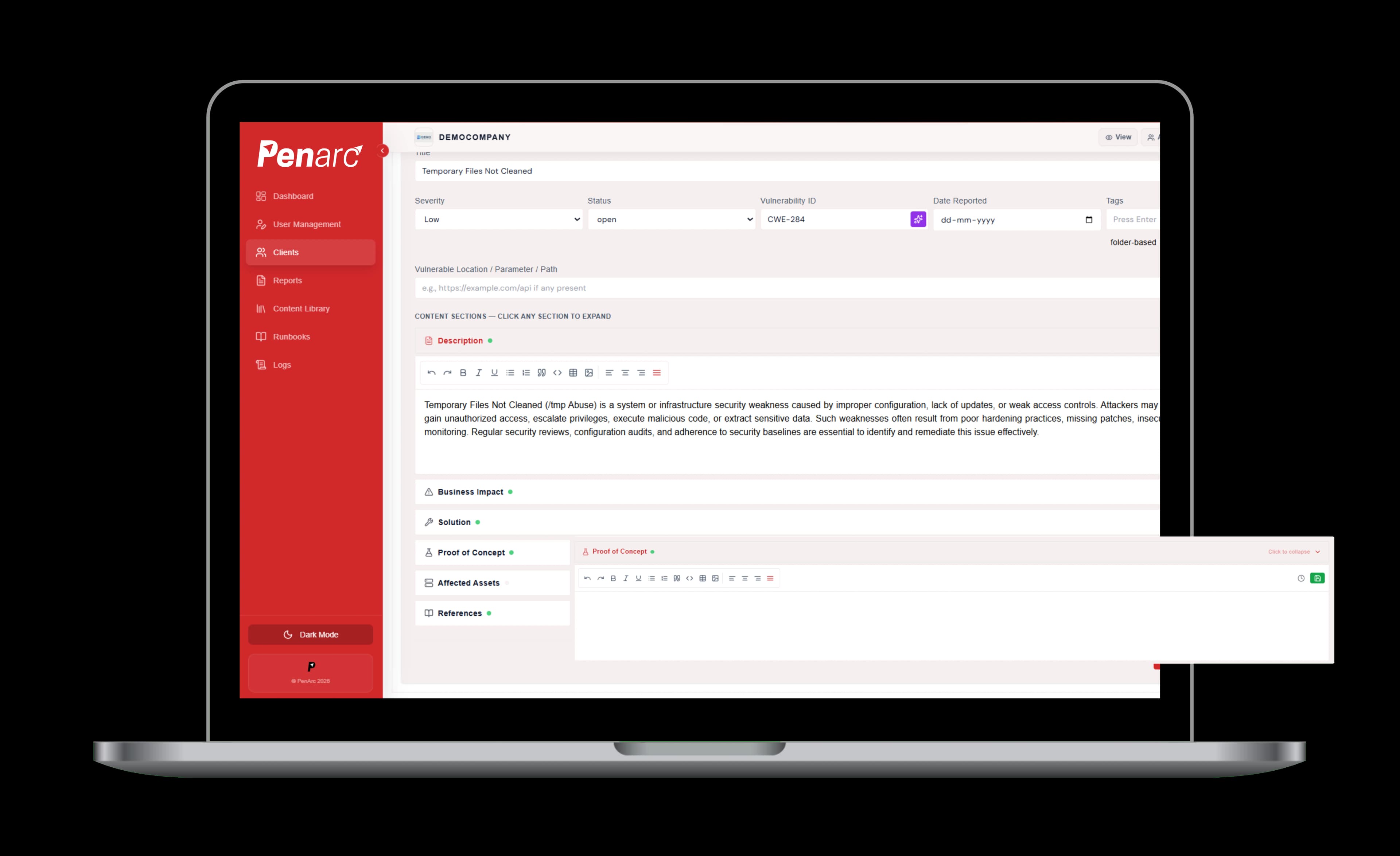Clients log in, view their findings, track remediation progress, and verify fixes in real time.